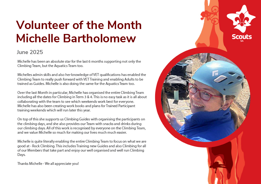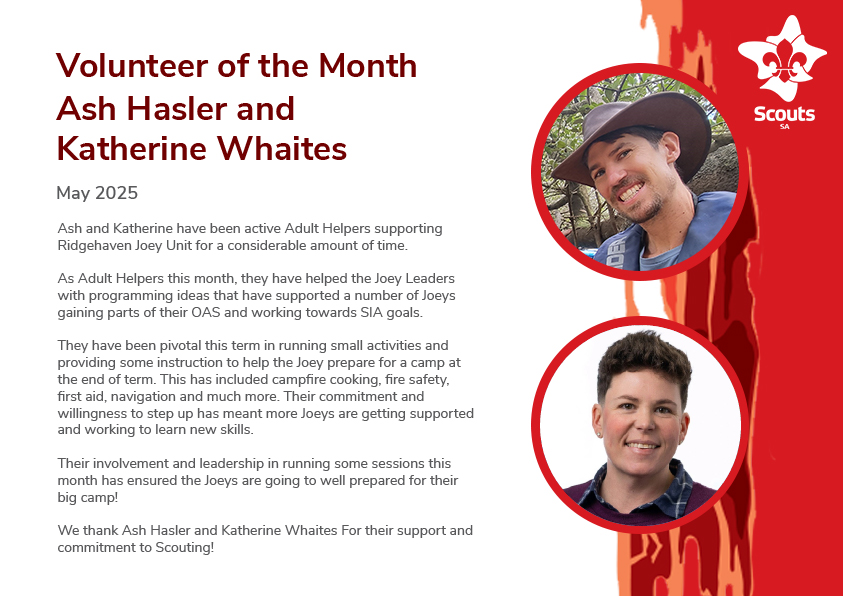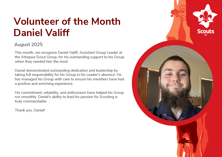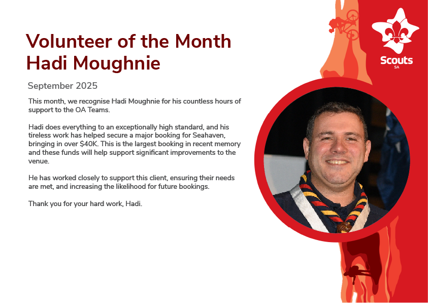 Successful nominees will receive a Volunteer of the Month certificate, a thank you gift, their name entered on the Scouts SA Q-Store website and an acknowledgment in a Scouts SA Update.