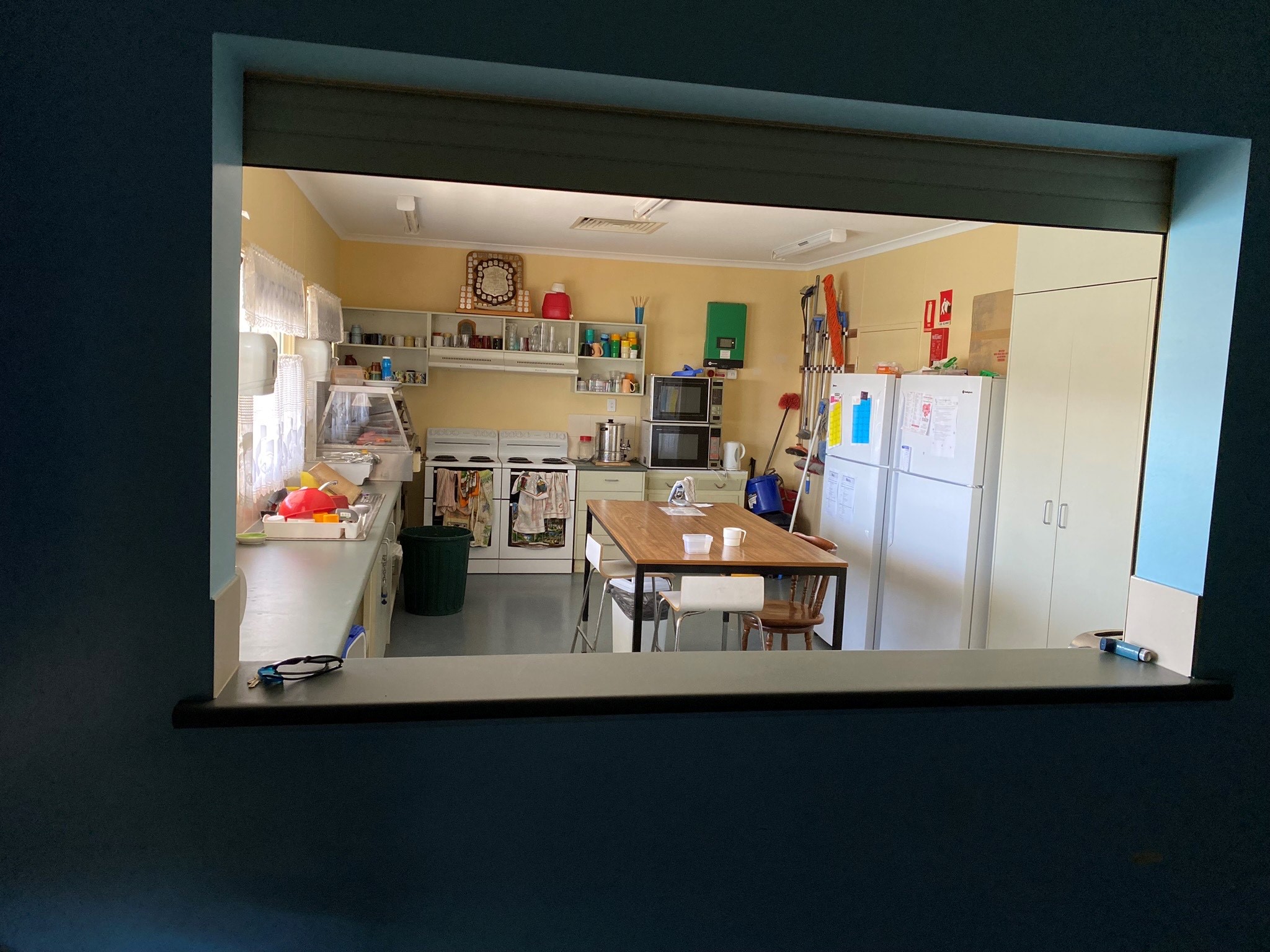 - 2 Fridge/freezers – no separate freezer, 2 electric stoves, workbench, 2 microwaves, toaster, pots and pans, cutlery and crockery.
